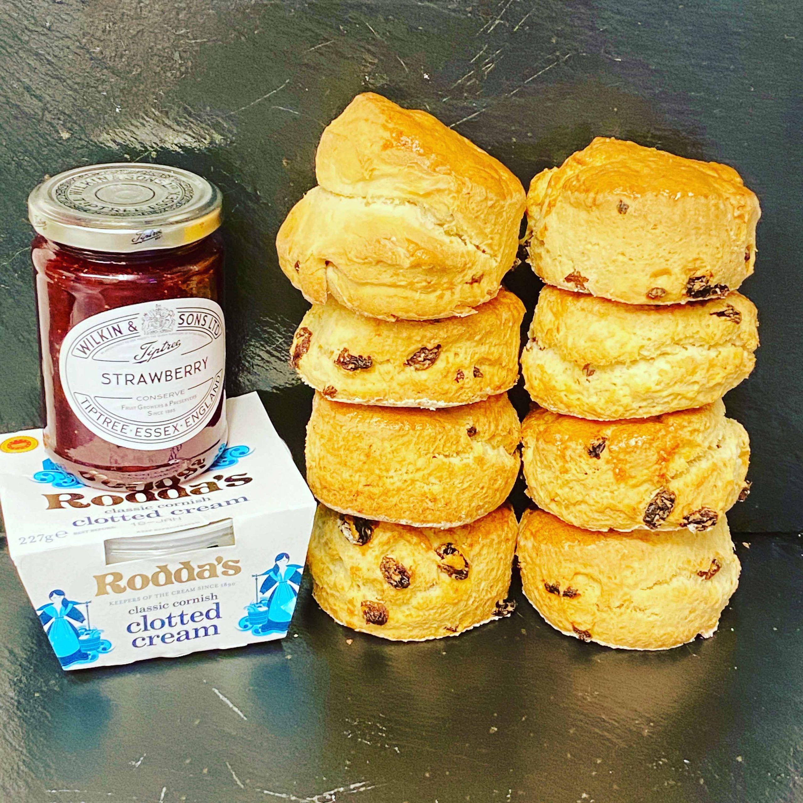 8 x Freshly baled large fruit scones, 1 x tub of Rodda’s clotted cream, 1 x jar of Tiptree jam.
